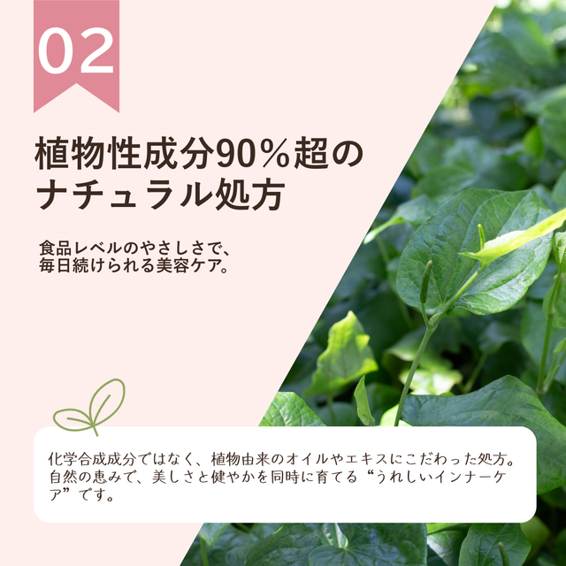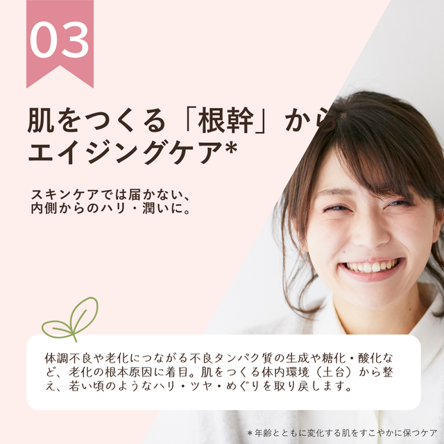 素材が持つ力とそれぞれの素材を活かす、相互の関係性を追求し、2つの主成分(ダブル主成分)と3つのサポート成分を1粒にぎゅっと閉じ込めました。